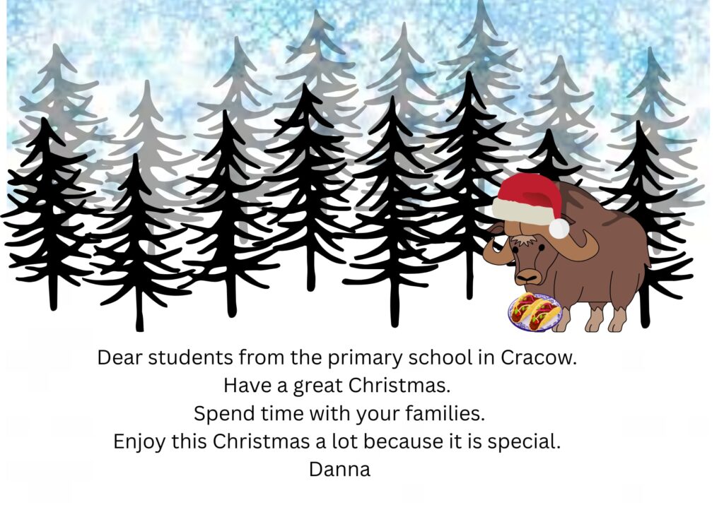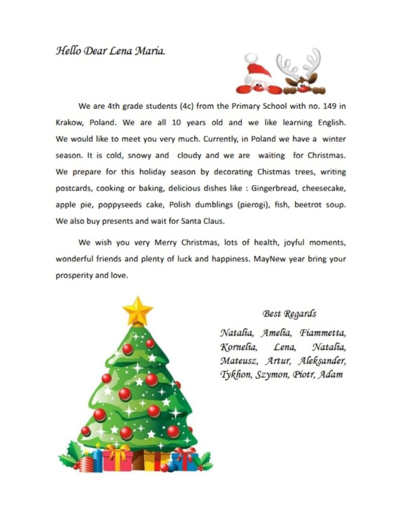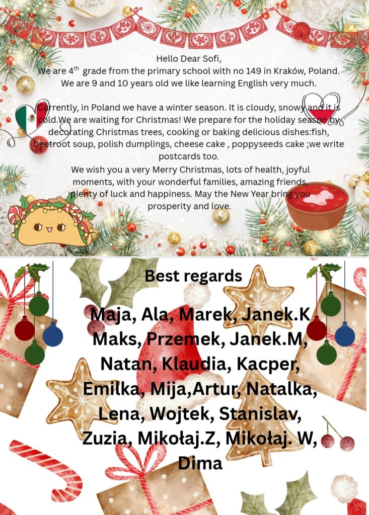 Uczniowie naszej szkoły przygotowali w grudniu i wysłali e-kartki z życzeniami bożonarodzeniowymi dozaprzyjaźnionej szkoły językowej z Meridy w odległym Meksyku prowadzonej przez doświadczoną nauczycielkę – Panią Olgę Marię Gonzales. W kartkach nasi uczniowie przedstawili się, opisali polskie tradycje świąteczne oraz ułożyli piękne życzenia świąteczne i noworoczne. W rewanżu dotarły do nas równie wspaniałe i barwne kartki z Meksyku z życzeniami dla całej naszej społeczności szkolnej.