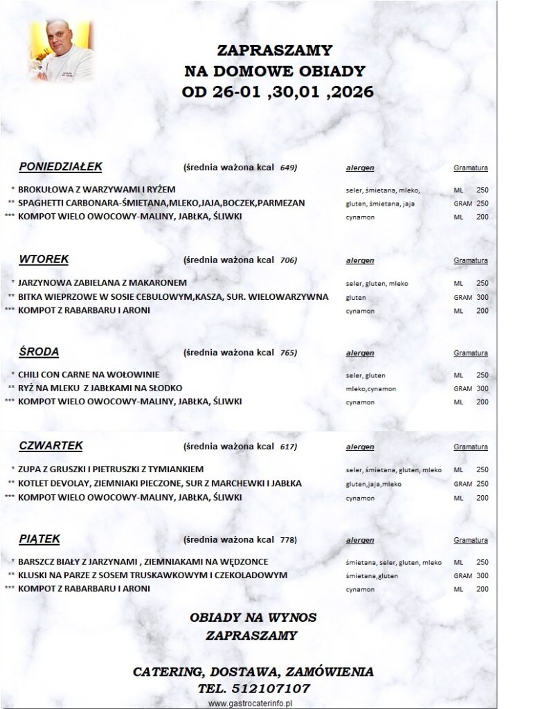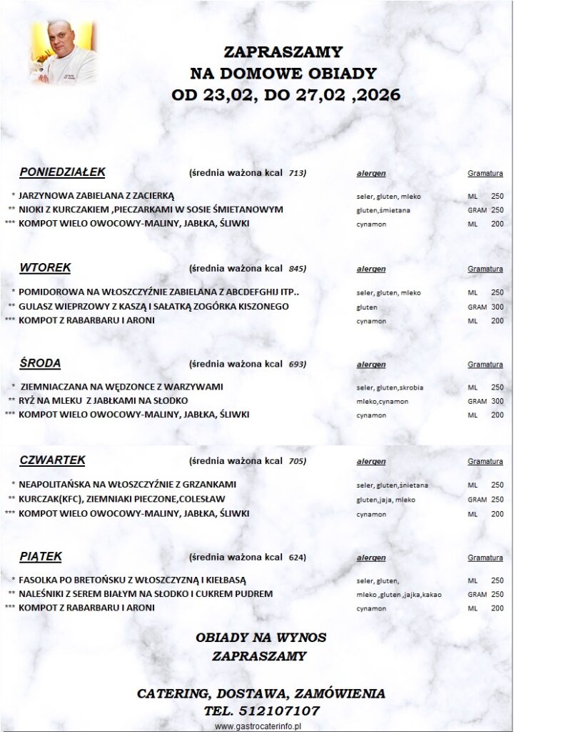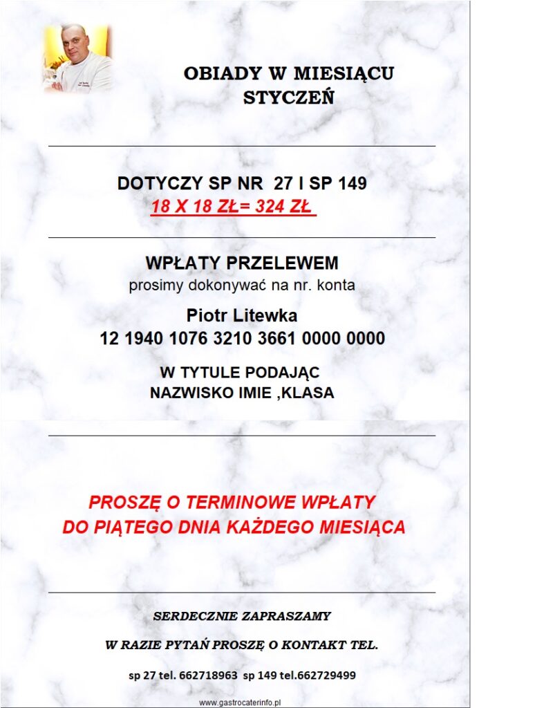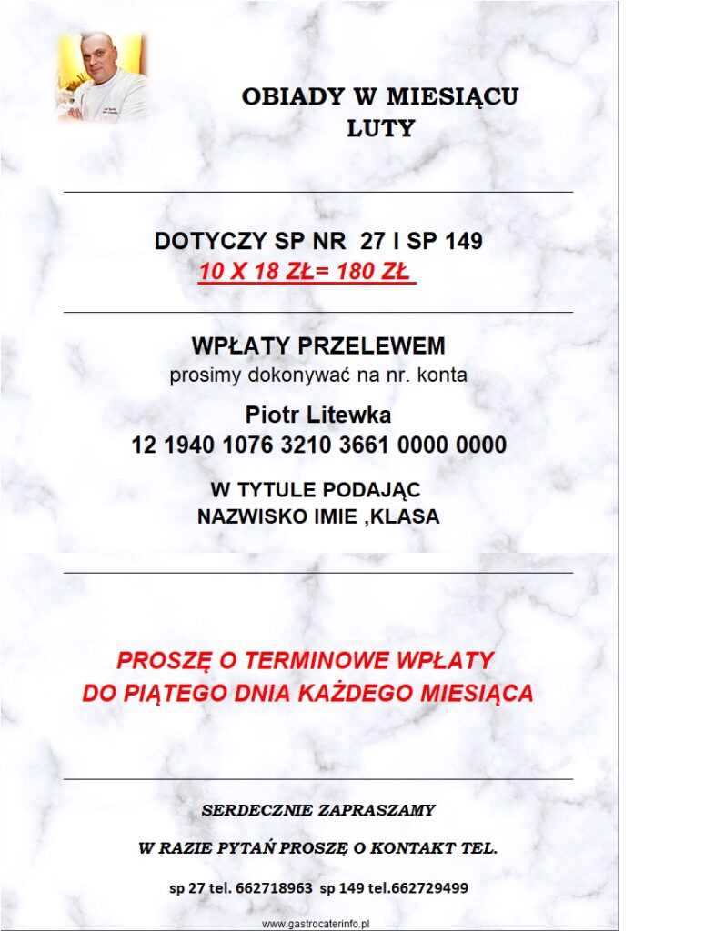 sTOŁÓWKA SZKOLNA662-729-499 KOD DO ZAPISÓW NA OBIADY Obiady wydajemy od pn – pt w godzinach od 11:15 do 14.45 Nowy numer telefonu do kontaktu ze stołówką i do odwoływania obiadów: 662-729-499 Zapraszamy do korzystania ze stołówki w roku szkolnym 2024/2025 Powodów jest wiele... 01. Posiłki przygotowywane są na miejscu w naszej kuchni. 02. Obiad składa się z zupy, drugiego dania i napoju Let's Talk 03. Obiady wydawane są w godz. 11:00 - 15:00 Wpłaty na obiady należy dokonywać na konto bankowe o numerze: Dane ajenta: Kompleksowe Usługi Cateringowe Piotr Litewka 12 1940 1076 3210 3661 0000 0000 KARTA OBIADOWA W razie pytań dotyczących płatności, diety itp proszę kontaktować się bezpośrednio z ajentem – nr telefonu 512 107 107Jadłospis będzie umieszczany na stronie internetowej szkoły. Wróć na stronę główną OBIADY NIE ODWOŁANE DO GODZINY 09.00 RANO POD NR. TEL 662 729 499 NIE BĘDĄ ROZLICZANE W ZESTAWIENIU MIESIĘCZNYM Harmonogram wydawania obiadów dla klas 1 - 3 w roku szkolnym 2025/2026W aktualizacji