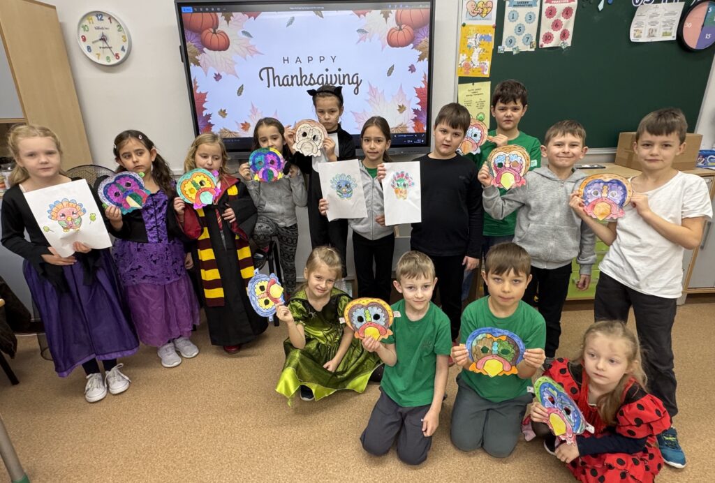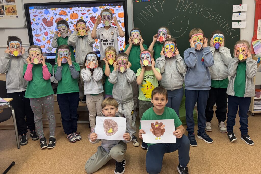 Podczas lekcji kulturowej projektu Future4Me ! dzieci poznały historię Thanksgiving – kim byli pierwsi osadnicy, skąd wzięła się tradycja dziękczynienia oraz jakie znaczenie ma to święto w kulturze Stanów Zjednoczonych. Podczas zajęć uczniowie nauczyli się nowych słówek związanych z Thanksgiving. Następnie wykonali tematyczne maski inspirowane symbolami święta.